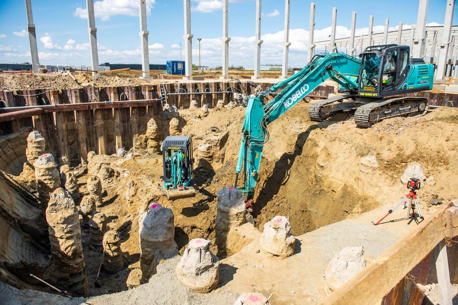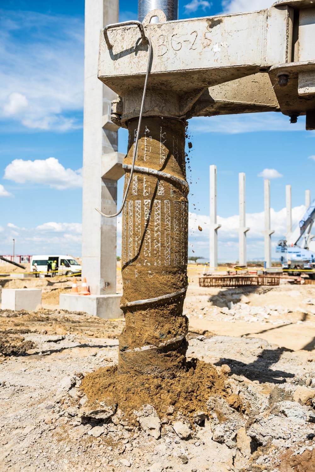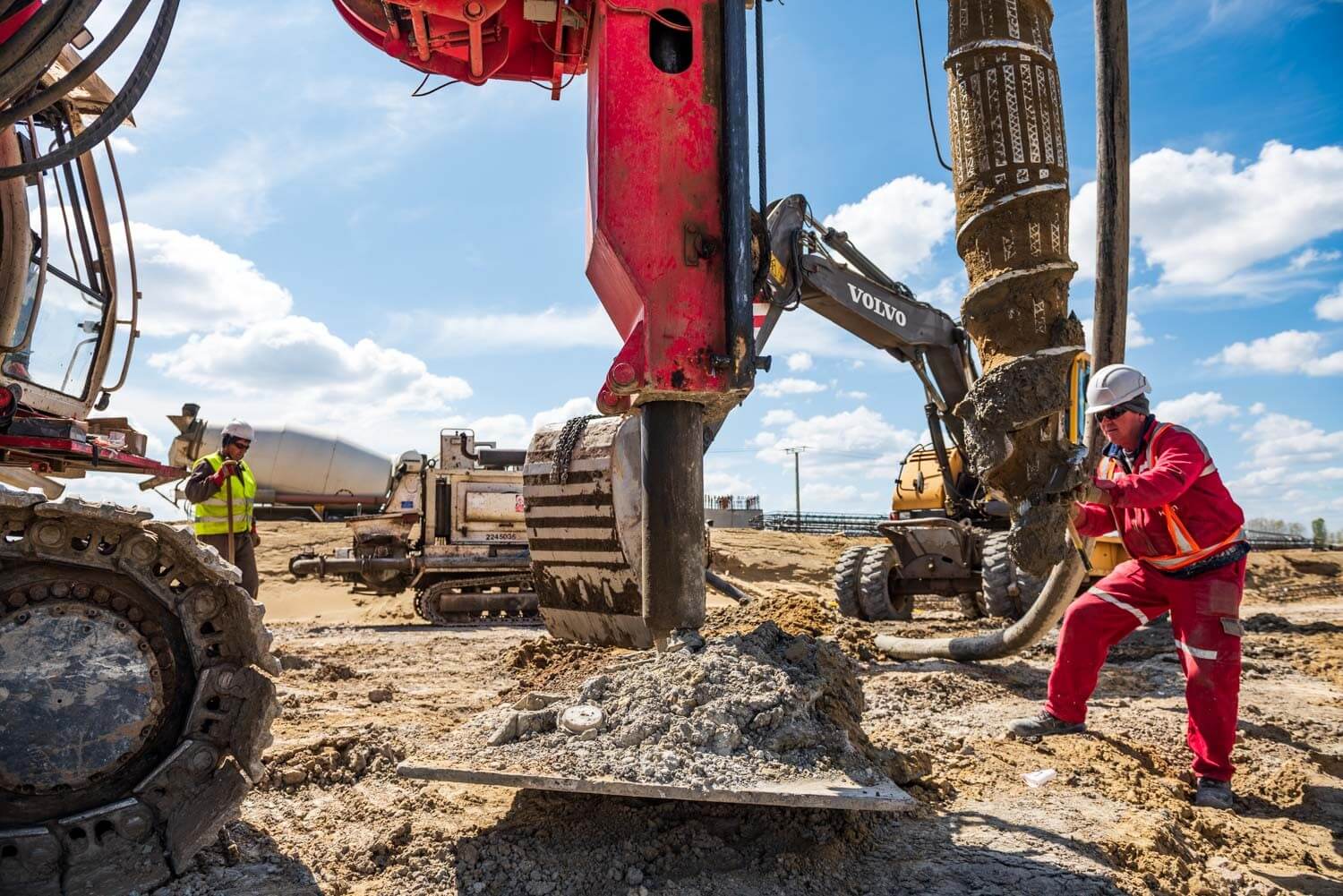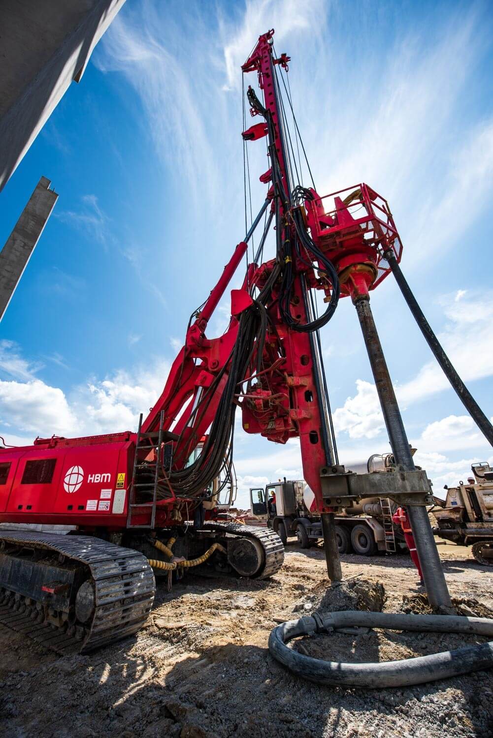 Az első munkafázisban a cölöpözést a HBM a francia anyacége által kifejlesztett Screwsol talajszorításos technologiával végezte el. A főmérnök elmondta: ez a megoldás abban különbözik a hagyományos talajkiszorításos cölöpöktől, hogy egy speciális vágókéssel felszerelt fúrófejjel dolgozzák be a betont a talajba. „A fúrószár forgatás mellettivisszahúzása során ez a vágókés belevág a talajba egy spirált” – mutatott rá, majd hozzátette: ennek következtébennagyobb teherbírás érhető el, mint a hagyományos cölöpözési megoldásoknál.