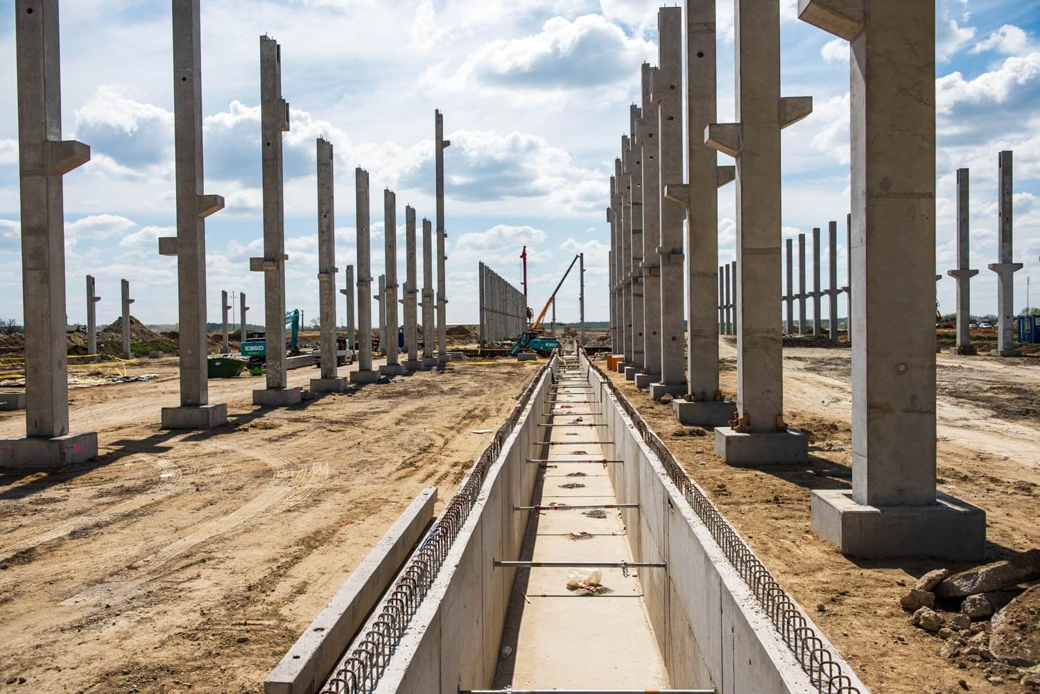 A főmérnök beszámolójában külön hangsúlyozza egy 20x80 méteres gépalap kialakítását: egy ekkorra területen a talaj változó szerkezetéből adódó kihívások kezeléséhez kiemelkedő szakmai megoldások kellenek. „Itt egy meghatározott raszterben – hálószerűen - fúrtuk le a cölöpöket. Egy klasszikus csarnokalapozásnál a terhelés a fejtömbökre jön le a pillérekről – ilyenkor a terhelési pont alá fúrjuk a cölöpöket, itt más megoldás kellett.” A 20x80 méteres alap nem az egyetlen ilyen típusú elem volt az építkezés során, emellett még több hasonló – bár kisebb volumenű feladatot is el kellett végezni az SRF gyárának építkezésén.