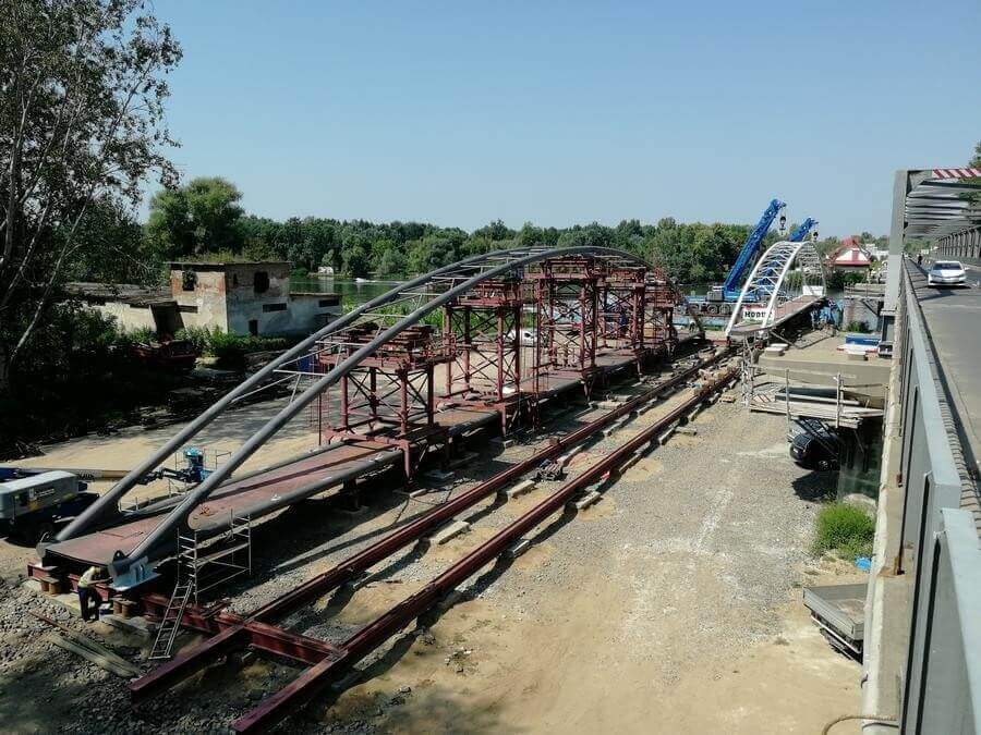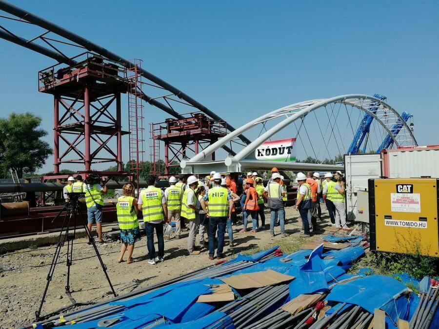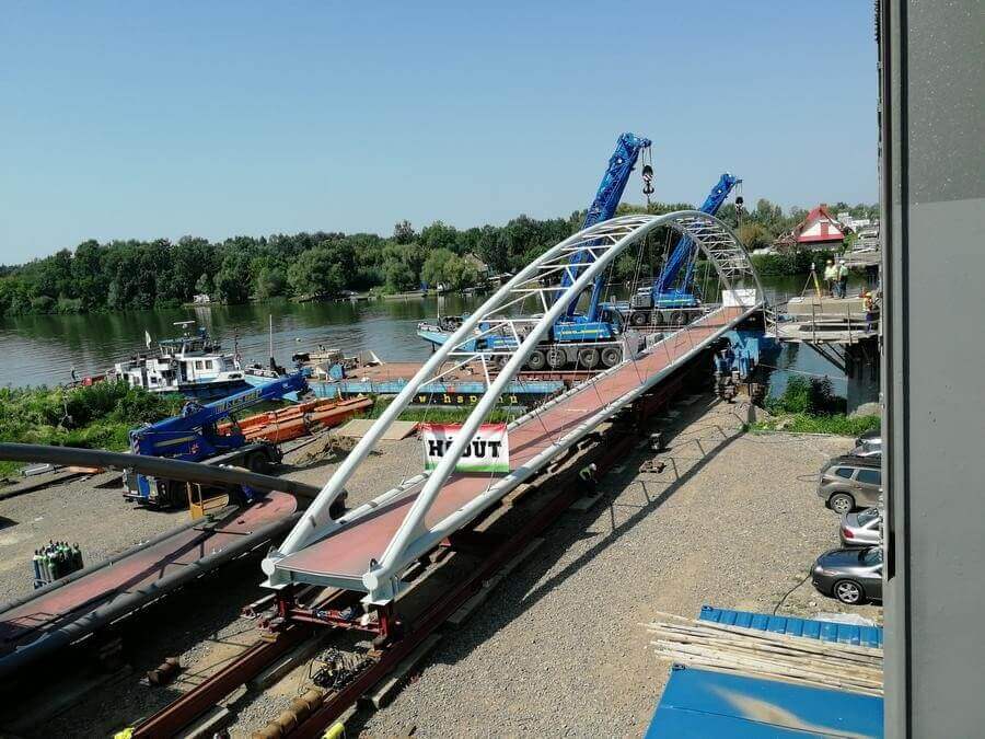 A 350 tonnás acélszerkezet előszerelése jelenleg is folyik a Tisza parton kialakított szerelőtéren, a mederhíd elemek vízi úton bejuttatva kerülnek a helyükre, az elsőt csütörtökön, augusztus 29-én emelik a helyére.