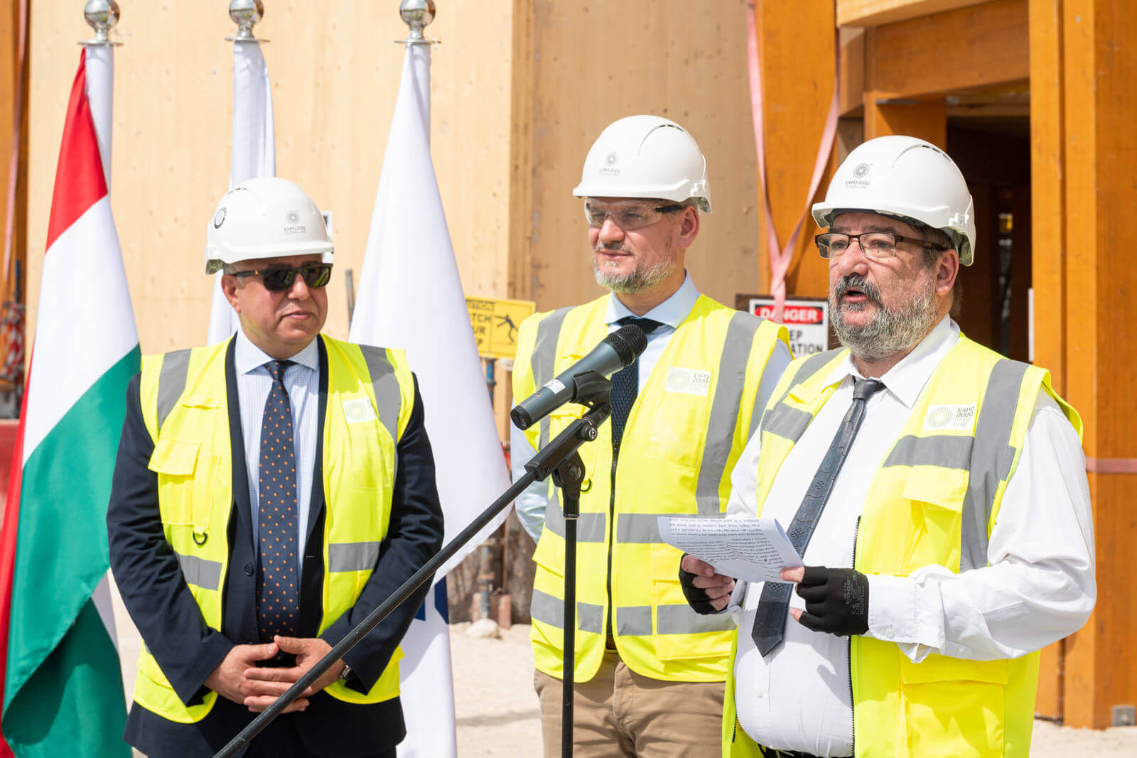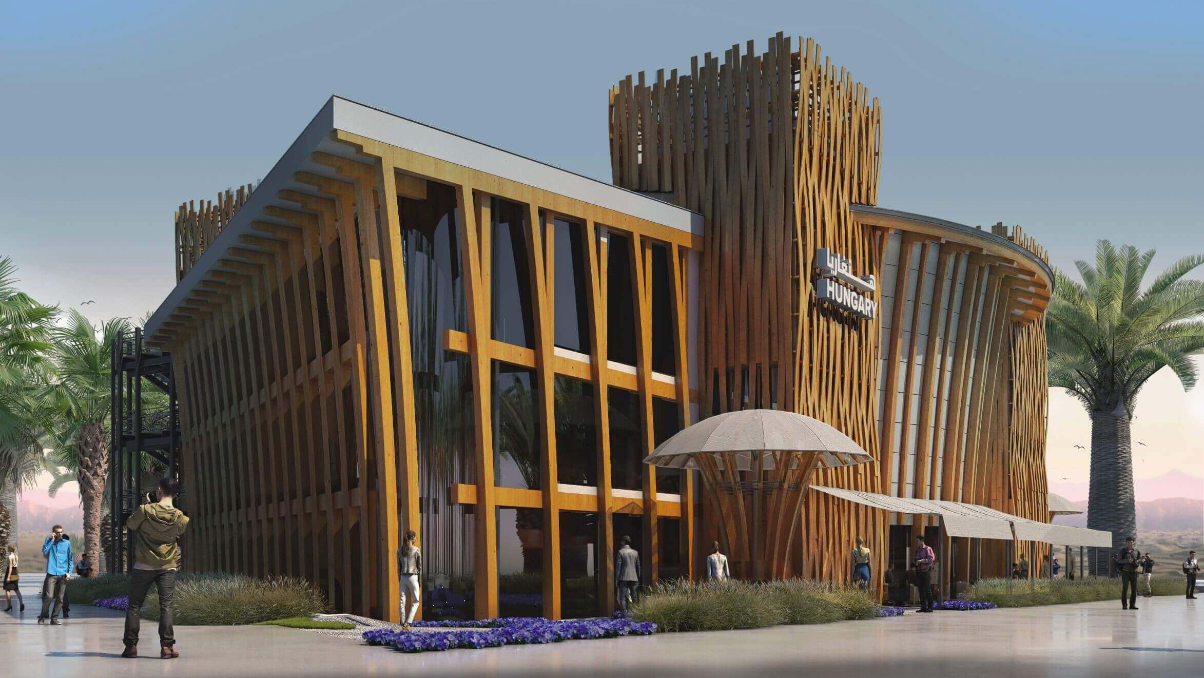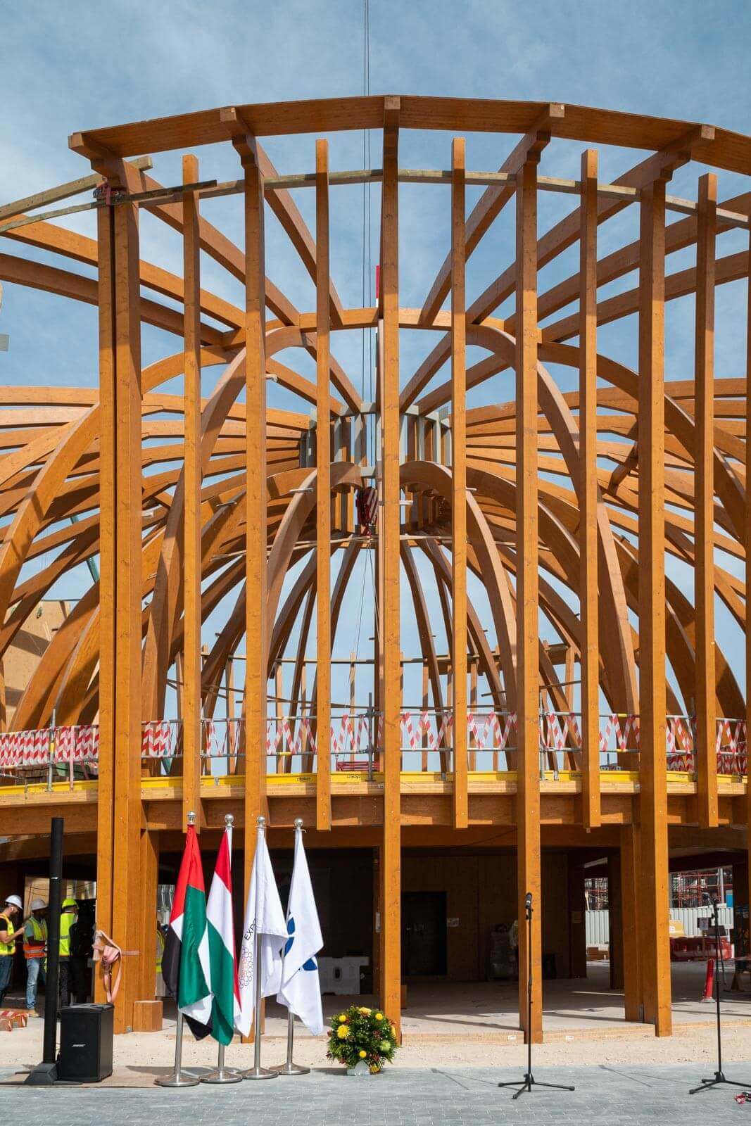 A közel-keleti helyszínen megtartották a Makovecz-iskolához tartozó Csernyus Lőrinc tervei alapján épülő 1927 négyzetméteres épület bokrétaünnepségét. A pavilon, melynek nemrég készült el a szerkezete, egy többszintes, kettős rétegű, faszerkezetű épület, amely egy belső kupolából és az azt körülvevő külső burokból áll.