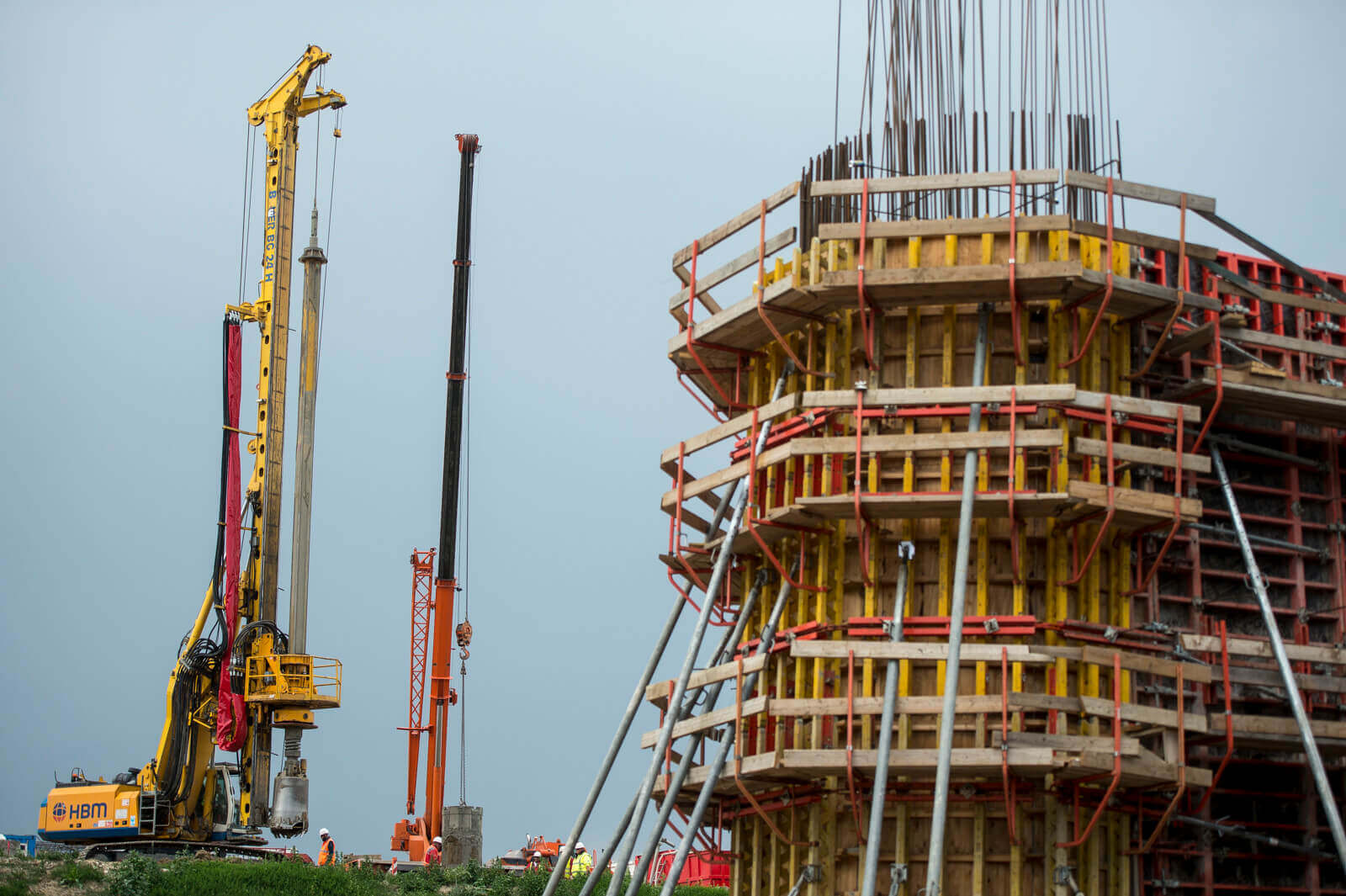 A két hídfő kivételével a többi támasz alapozása elkészült, a pillérek építése van folyamatban. Elkezdődött a mederhidat tartó pilonok építése.