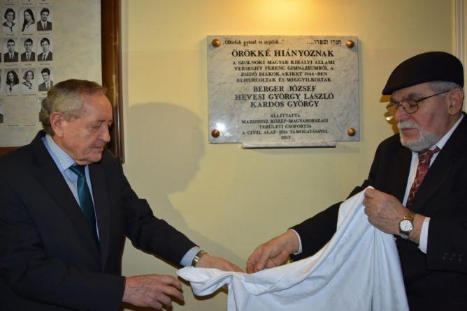 Emléktáblát helyezett el az 1944-ben elhurcolt és meggyilkolt tanulók emlékére a szolnoki Verseghy Ferenc Gimnázium falán a Magyarországi Zsidó Hitközségek Szövetsége (Mazsihisz) közép-magyarországi területi csoportja a Civil Alap 2014 támogatásával a holokauszt-emlékév részeként szerdán.