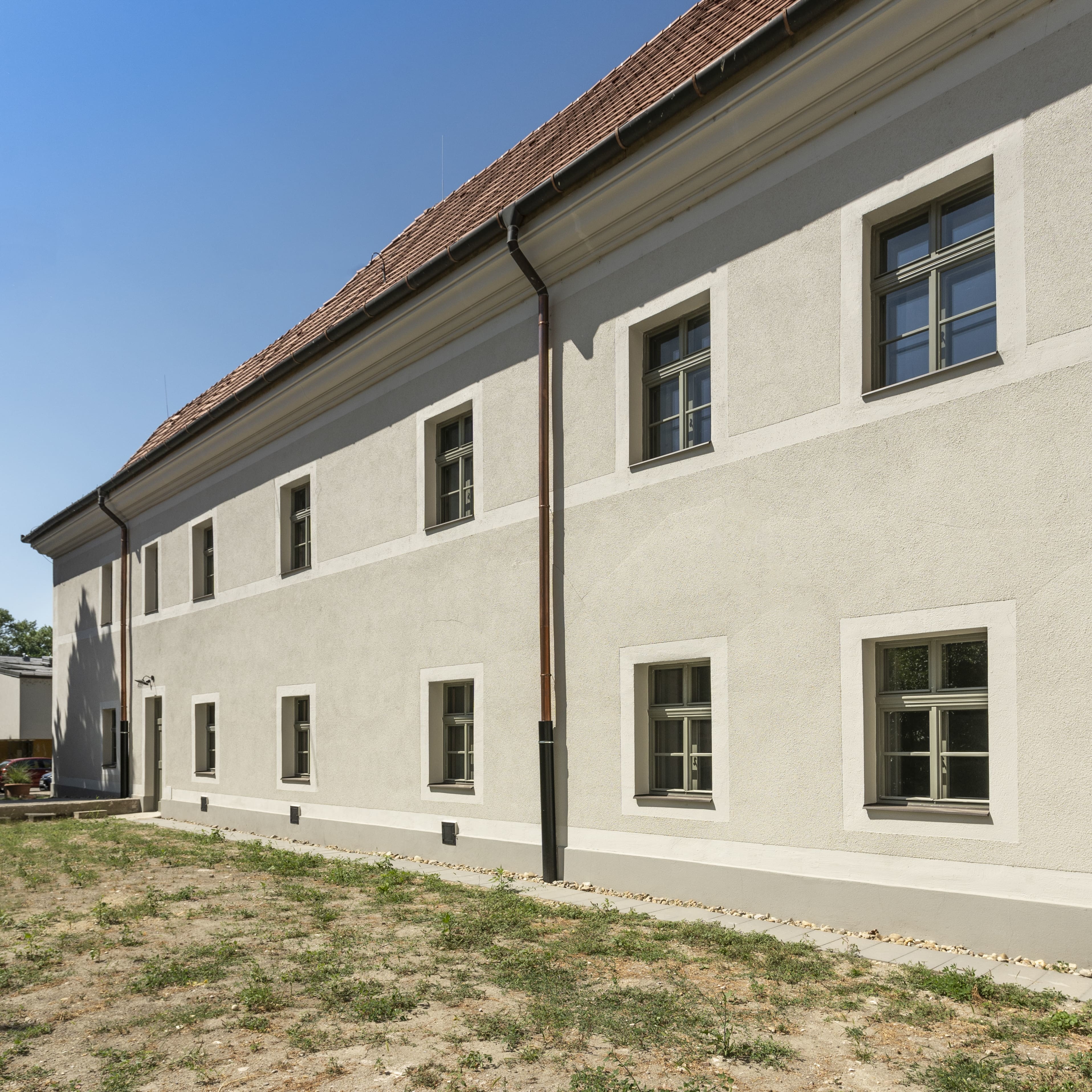 A plébánia homlokzatai rendkívül puritán, dísztelen megfogalmazású felületek, mindössze a kiugró főpárkány oldja a szigorúságot. A felújítás során ezt az egyszerűséget példaértékű szakmai alázattal tartották tiszteletben. A visszafogott, monokróm színharmóniák és a kétféle vakolatstruktúrával kialakított plasztikus homlokzati felületek pontosan ragadják meg az eredeti épület üzenetét.