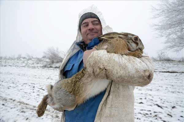 Egy mezei nyúl a hálóban 2016. január 8-án a Hofi Géza Vadásztársaság tiszapüspöki területén, ahol megkezdődött a vadnyulak befogása.