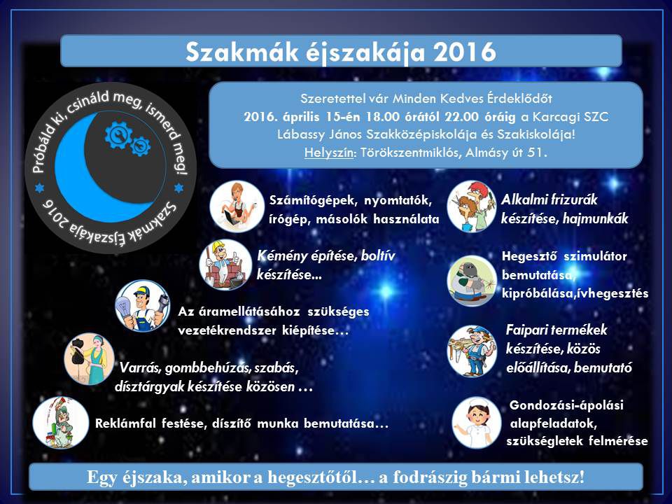 „Próbáld ki, csináld meg, ismerd meg „ mottóval indul a Szakmák Éjszakája. Egy éjszaka, amikor a hegesztőtől a fodrászig bármi lehetsz! Ehhez most nem kell mást tenni, csak ellátogatni 2016. április 15-én a Karcagi SZC Lábassy János Szakközépiskolába ahol 18 - 22 óráig lesz lehetőség egy-egy munkafolyamatba betekinteni illetve kipróbálni.