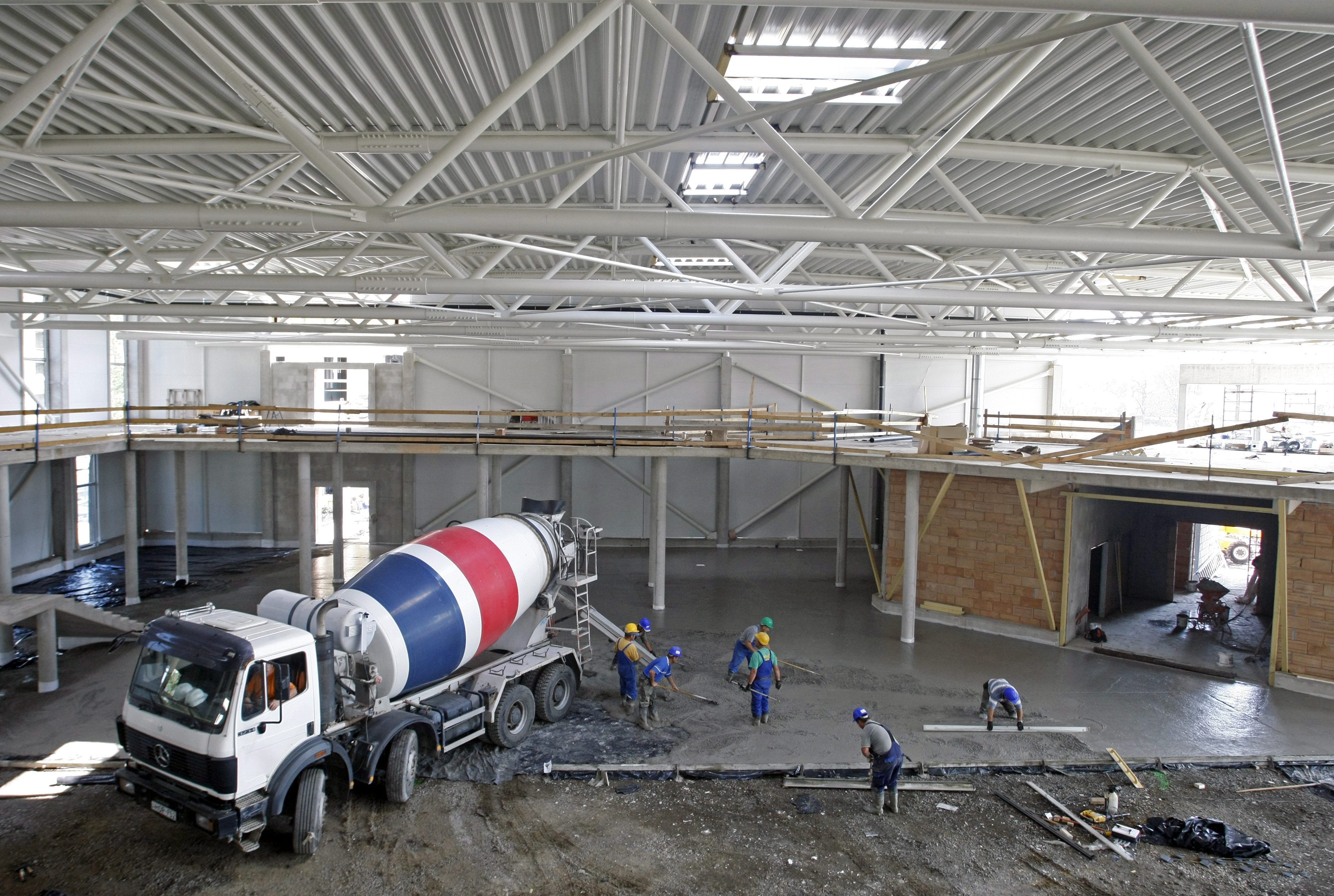 Szakemberek betonoznak egy betonkeverő teherautó mellett a REPtár Szolnoki Interaktív Repülőmúzeum építési munkálatai során 2015. szeptember 23-án. A közel 3 milliárd forintos, teljes egészében európai uniós forrásból megvalósuló beruházás eredményeként várhatóan októberben költözik az eddig a Szolnoki Repüléstörténeti Kiállítóhelyen lévő katonai repülőgép-gyűjtemény az új komplexumba.